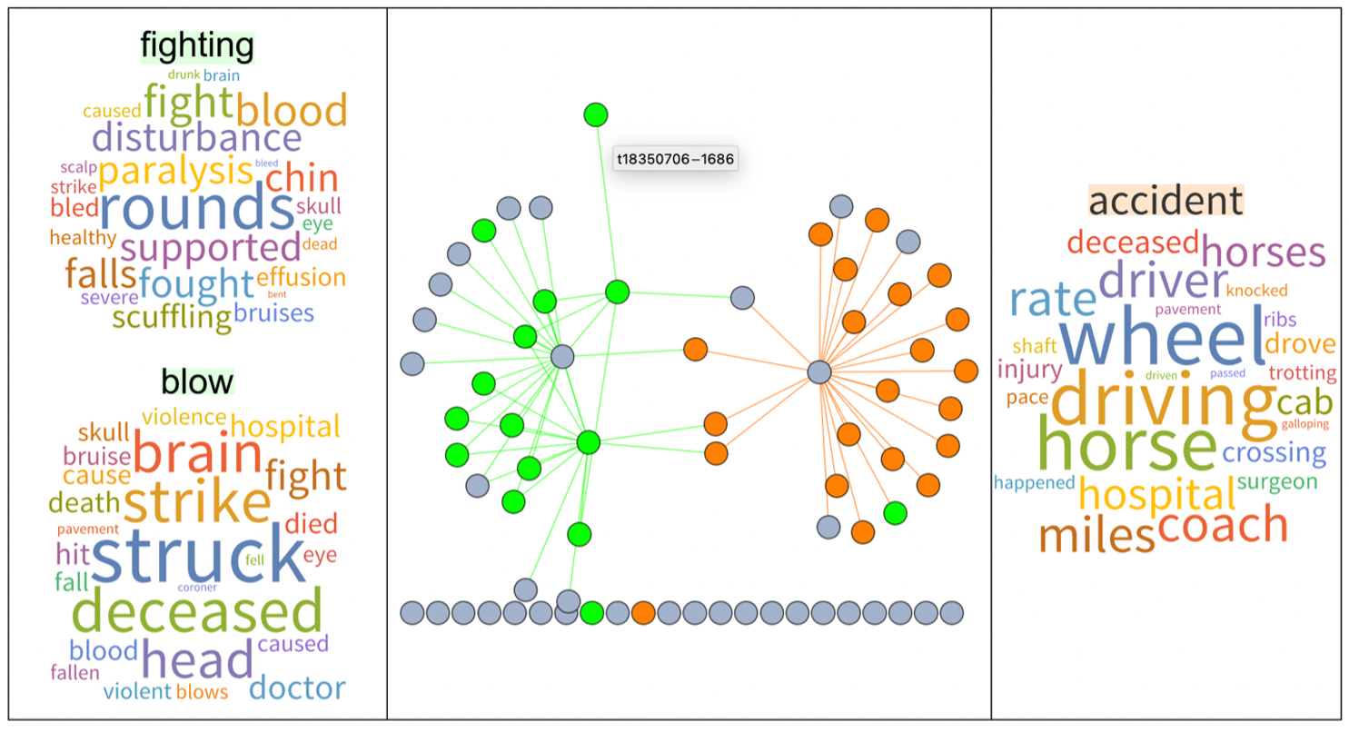 On the Wilkinson trial, I can see why the TF-IDF came up as an accident, and I suspect I was second guessing the text myself. There are two things that made me label it a fight. First, the quantity of blood; and second, the general rush to declare it an accident. In my experience it is pretty hard to kill yourself by accidentally falling over and hitting your head on a ledge halfway up a wall (I have tried); and if you do manage it, getting blood all over the place seems odd. And if it was an accident, why did Wilkinson not call out, and instead waited until the watchhouse keeper came down 45 minutes after putting Wilkinson in the cell? And if the dead guy could chat with three different people in the three weeks before his death, including about the seriousness of his wound, why he didn’t say something about how it happened, is just a bit weird. Just looking at the account, it feels like the sort of thing where there were lots of opposing narratives presented at the coroner’s inquest (hence the trial), that gradually got edited out on the way to court. On the face of it, there is no obvious reason it has come to trial at all. But again, I suspect that this is just me second guessing!