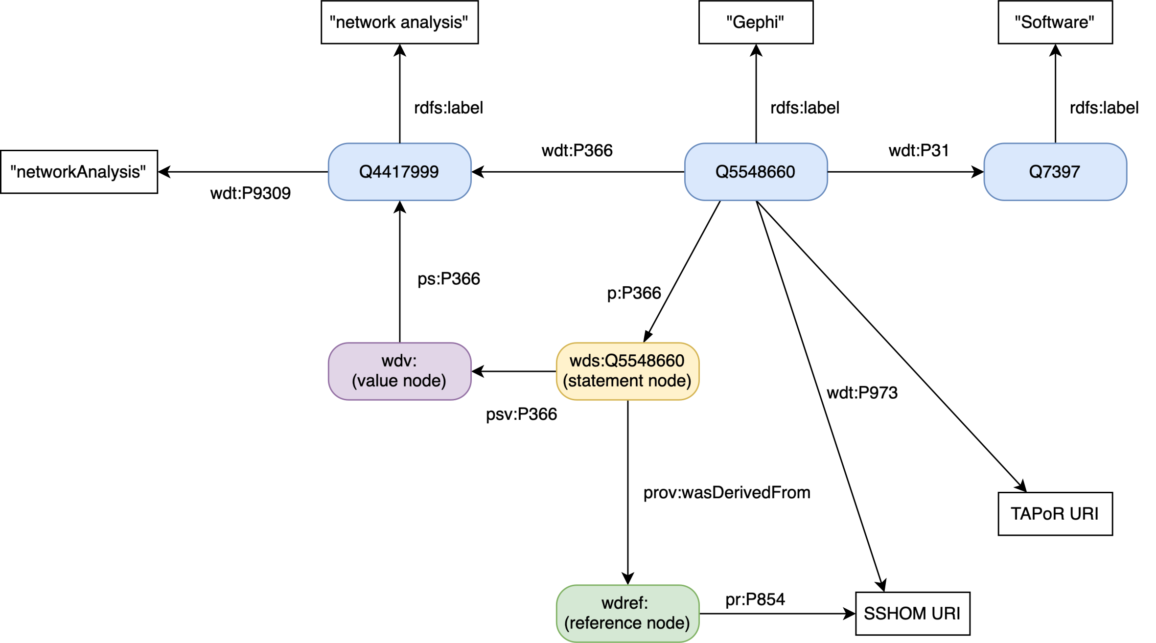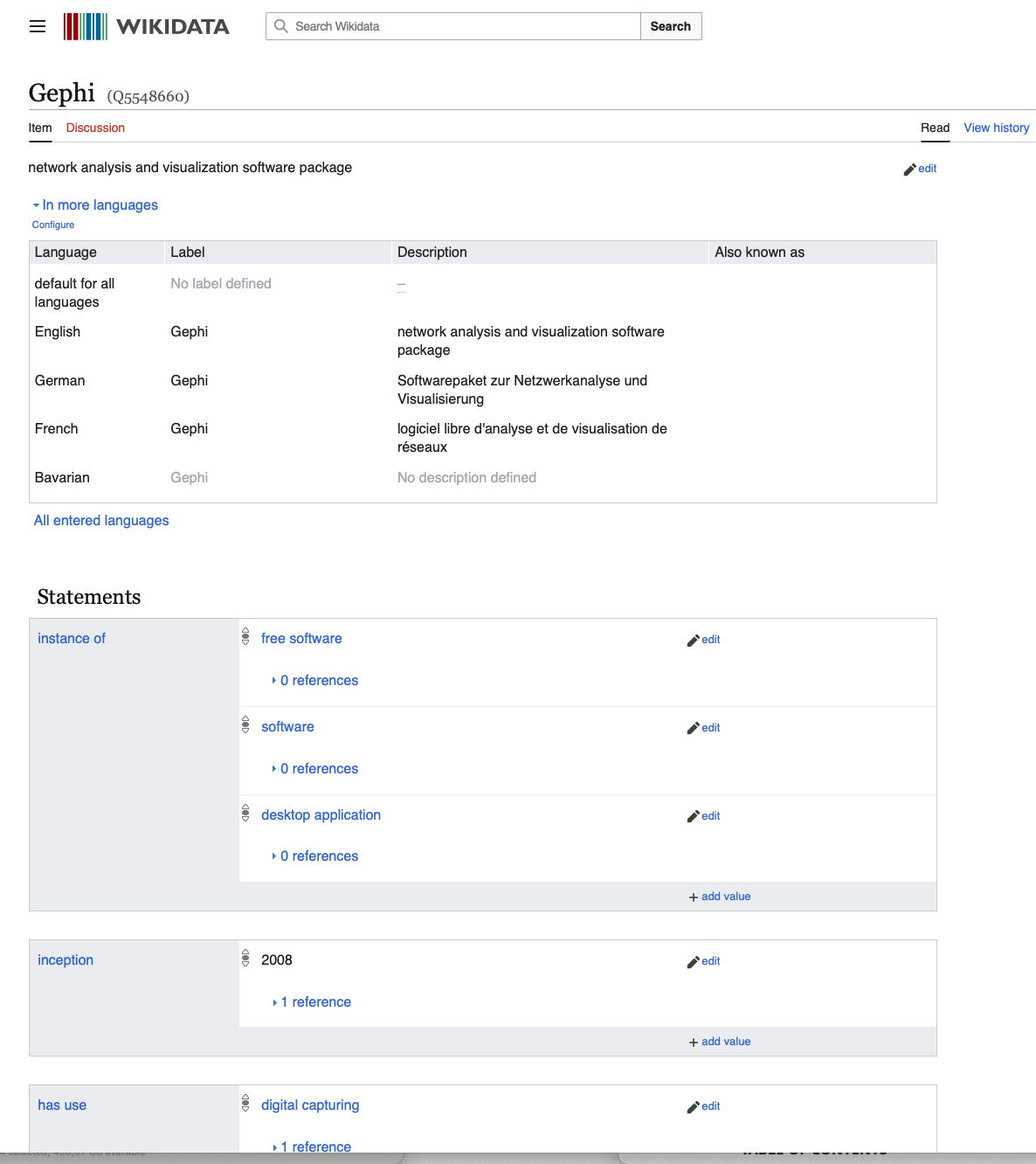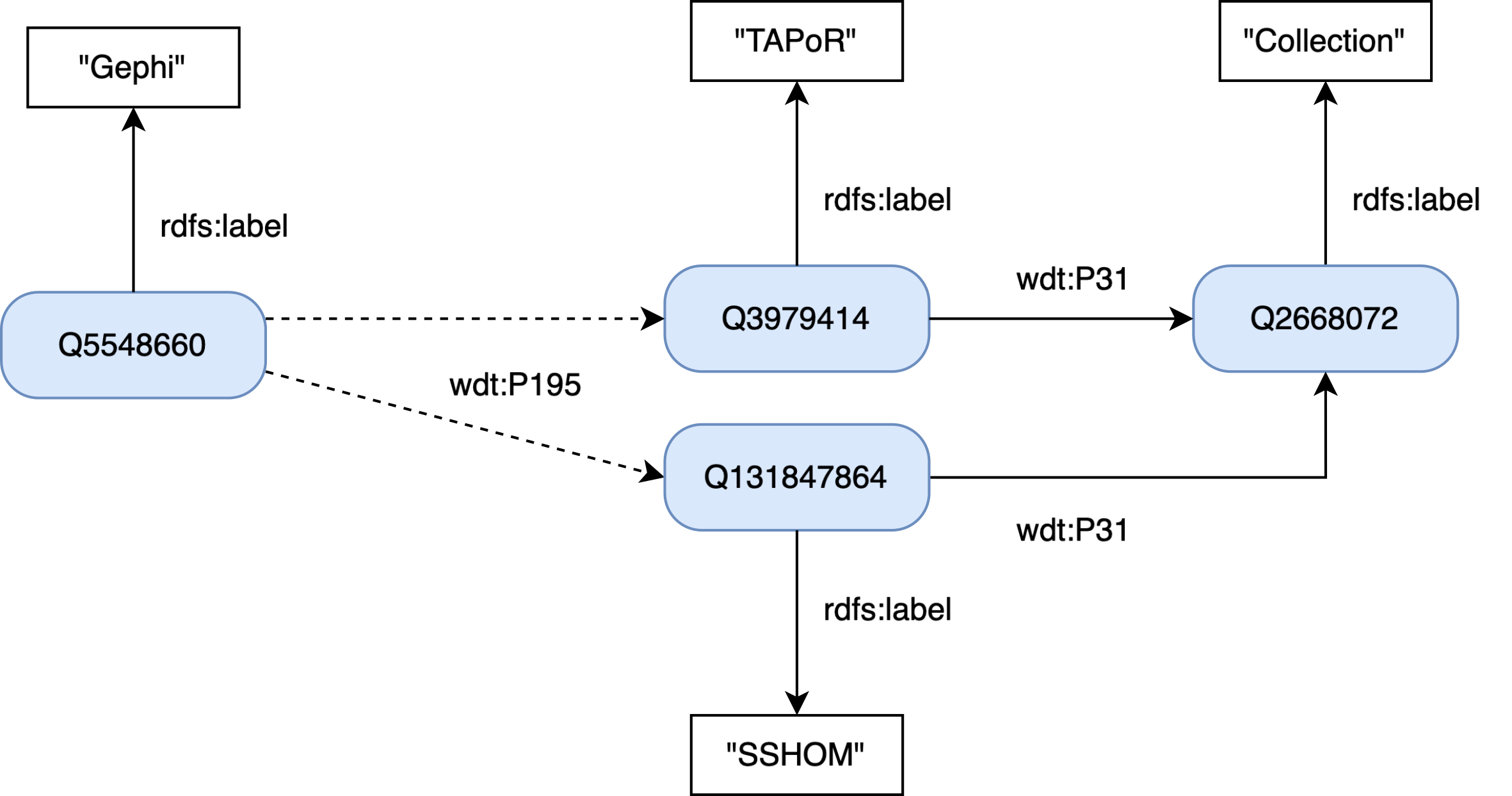 This query returns the IDs of items and their labels as a potential sanity check for human readers. The ID can then be used in further SPARQL queries, API calls, or the plethora of tools for interacting with Wikidata hosted on Toolforge, ranging from Scholia, a long-running project for querying and visualising scientometrics [Nielsen, Mietchen, and Willighagen 2017], to Reasonator, which displays Wikidata items in a view optimised for their particular item-type and enhanced with some basic reasoning.SELECT DISTINCT ?tool ?toolLabel # only get Software-ID and Software-Name WHERE { ?method wdt:P9309 ?tadirahID. # Variable method is a tadirah-method ?tool wdt:P366 ?method; # Variable tool 'has method' method (wdt:P31/(wdt:P279*)) wd:Q7397. # and tool is child of "Software" SERVICE wikibase:label { # set wikibase-service to auto-language with fallback english bd:serviceParam wikibase:language "[AUTO_LANGUAGE],en". # get the tool-label (=name) of our tool. ?tool rdfs:label ?toolLabel. } }